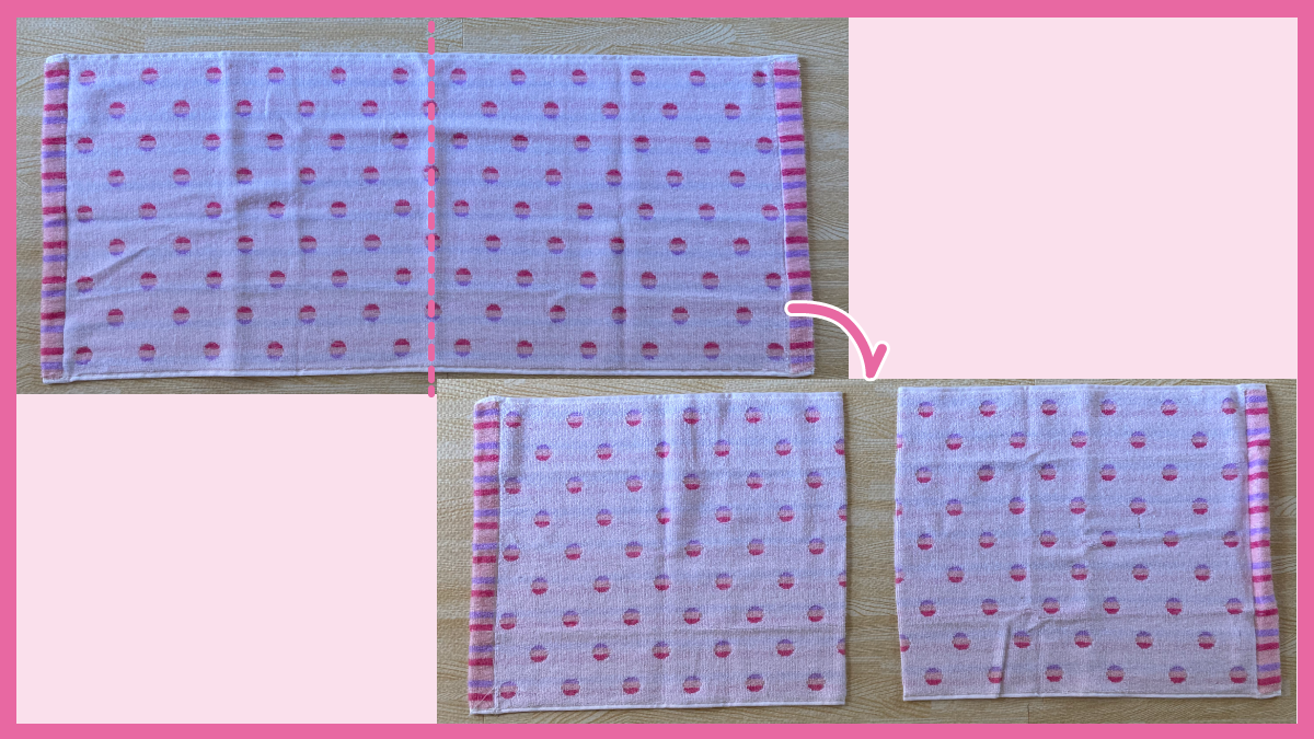 フェイスタオルを準備して中央をハサミで切って2枚にします。