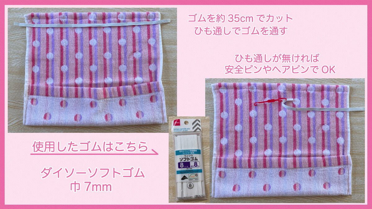 今回使用したゴムはダイソーで購入した巾7mmのゴムです。巾10mm以内が使用しやすいと思います。